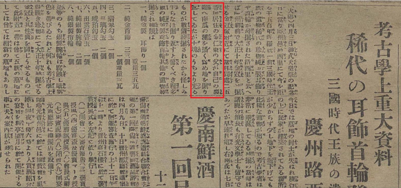 즉각 신고가 이뤄졌고, 총독부 박물관은 발굴전문가로 아리미쓰 교이치(有光敎一·1907~2011)를 급파합니다. 발굴결과 순금제 목걸이 33점과 곡옥·관옥·환옥 달린 목걸이, 순금제 귀고리 등 수십 여 점의 유물을 수습했습니다. <조선시보>는 4월9일부터 20일과 21일까지 ‘고고학상 중대자료 희대의 귀고리 장식 발견’ 등의 제목으로 대서특필했습니다. 아리미쓰는 유물이 발굴한 곳을 노서리 140호분에 딸린 무덤으로 여겼습니다. 그러나 발굴은 그것으로 끝났습니다.