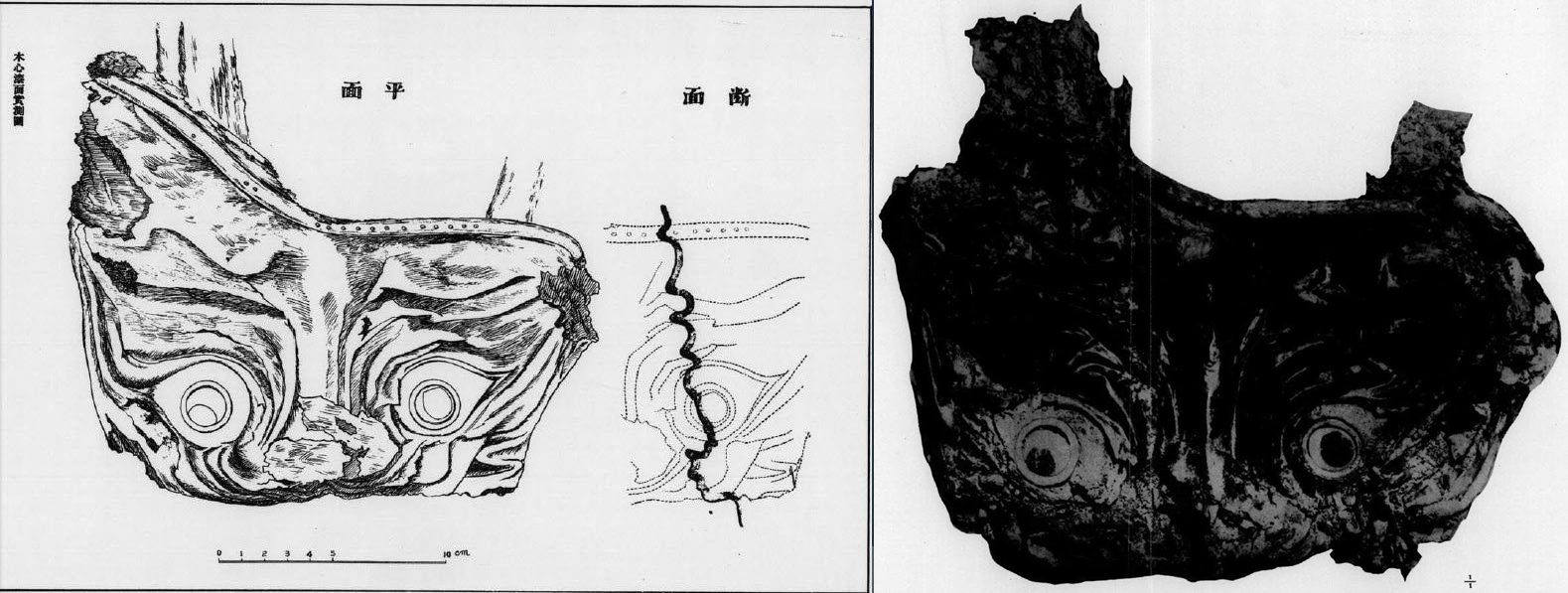 나무로 만든 위에 옻칠을 했는데 눈알은 유리이고 그 홍채에 해당하는 부분은 푸른빛이었으니 발굴자들이 소름끼칠 만했죠. 당시 연구자들은 그 유물을 ‘방상씨면’이라 규정하고 “방상씨는 웅피(熊皮)를 쓰고, 황금 눈 넷을 단 면을 쓰며 무기를 들고 역귀를 몰아내는 존재”라는 <주례(周禮)>를 인용했어요.