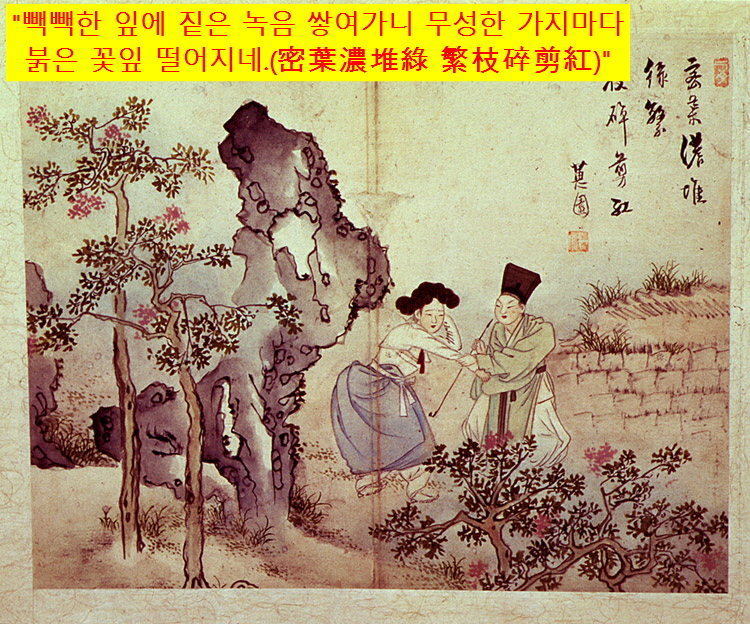 ‘소년전홍’이라는 그림은 어떻습니까. 막 혼인한 듯한 젊은 유생이 여자종인듯한 여인의 손목을 잡는 그림인데요. 그림에 ‘빽빽한 잎에 짙은 녹음 쌓여가니 무성한 가지마다 붉은 꽃잎 떨어지네(葉濃堆綠 繁枝碎剪紅)’라는 시가 있습니다. ‘어린 소년(少年)이 여인, 즉 꽃을 꺾다(剪紅)’는 뜻으로 ‘소년전홍(少年剪紅)’이라는 제목이 붙었답니다. 이뿐이 아닙니다.