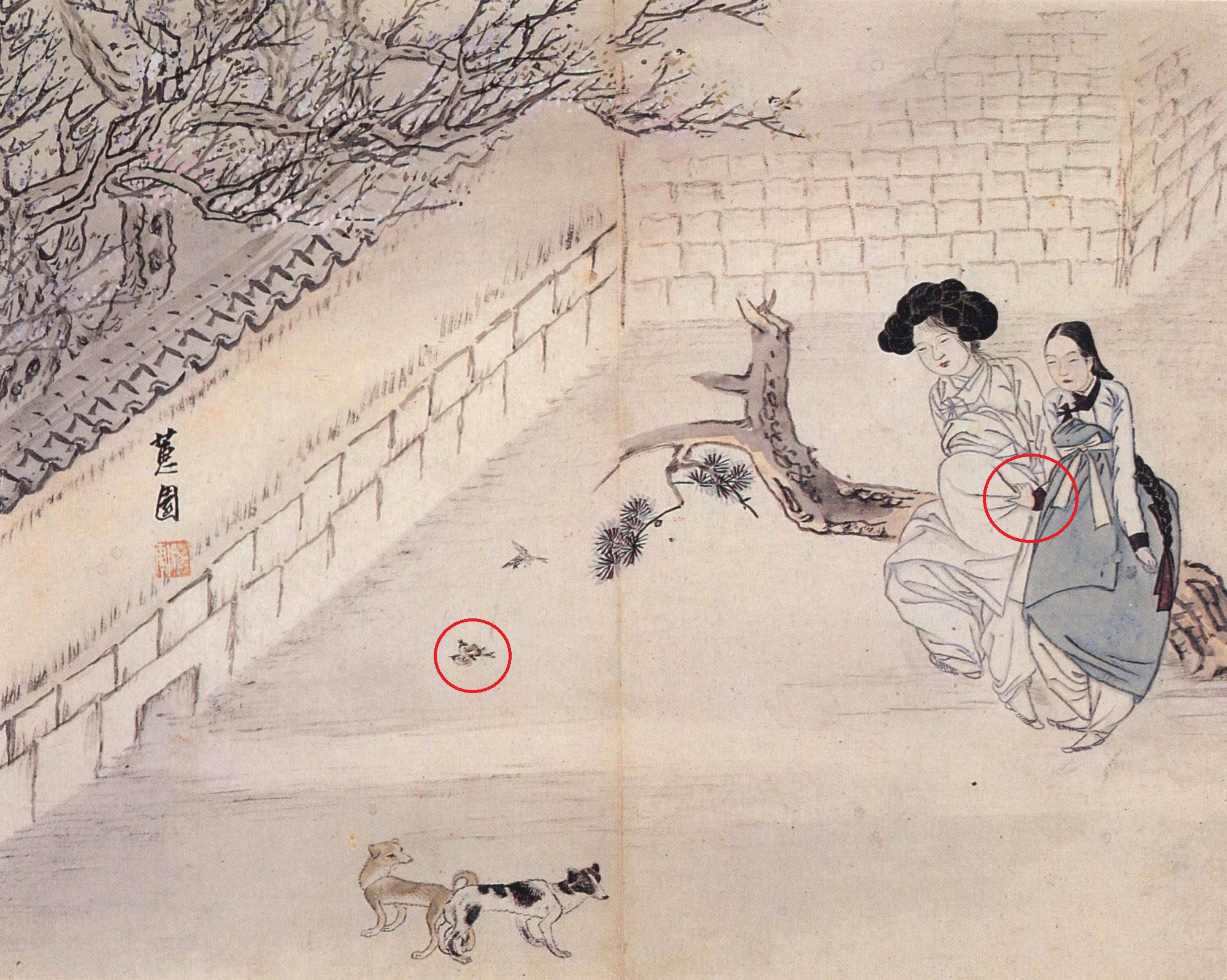 또 소복입은 여인이 몸종과 함께 개들의 짝짓기 모습을 바라보고 있는 ‘이부탐춘’ 그림도 시사하는 바가 크죠. ‘이부탐춘(리婦耽春)’은 ‘과부가 봄빛을 탐한다’는 뜻인데요. 남편을 잃은 부인이 재혼하기 어려웠던 조선 사회의 결혼풍속을 비꼰 그림일 수 있습니다.