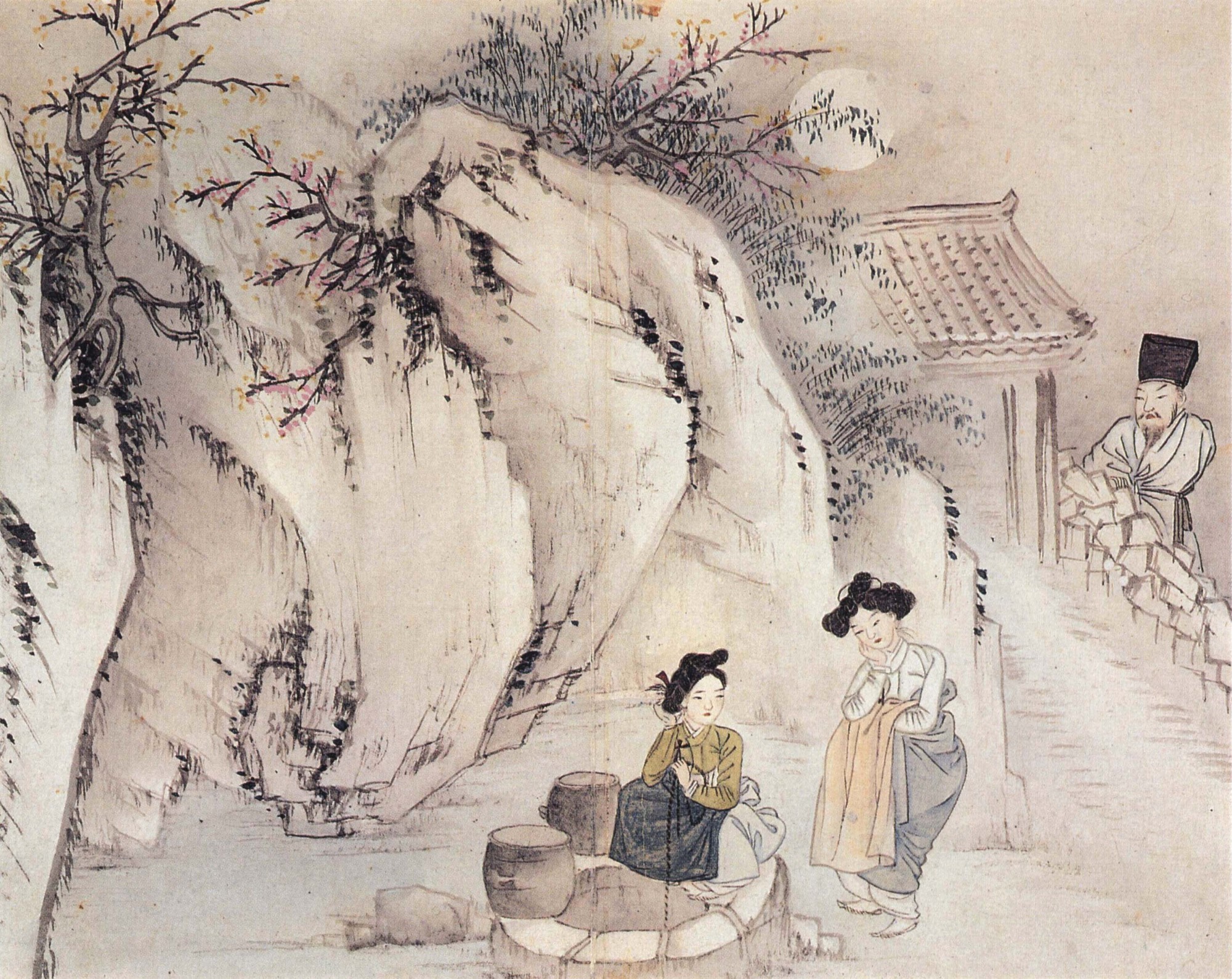 그러나 다시 헤어져야 할 운명이겠죠. 조마조마 가슴 졸이며 지켜보는 여인은 이 밀회를 성사시킨 장본인이 아닐까요. 혹자는 이 그림을 두고 ‘조선 최초의 키스신’이라 합니다. 저 진한 두 남녀의 애정신을 바라보는 여인의 심정은 어떨까요. 들킬까 조마조마 하면서 애간장이 녹겠죠.