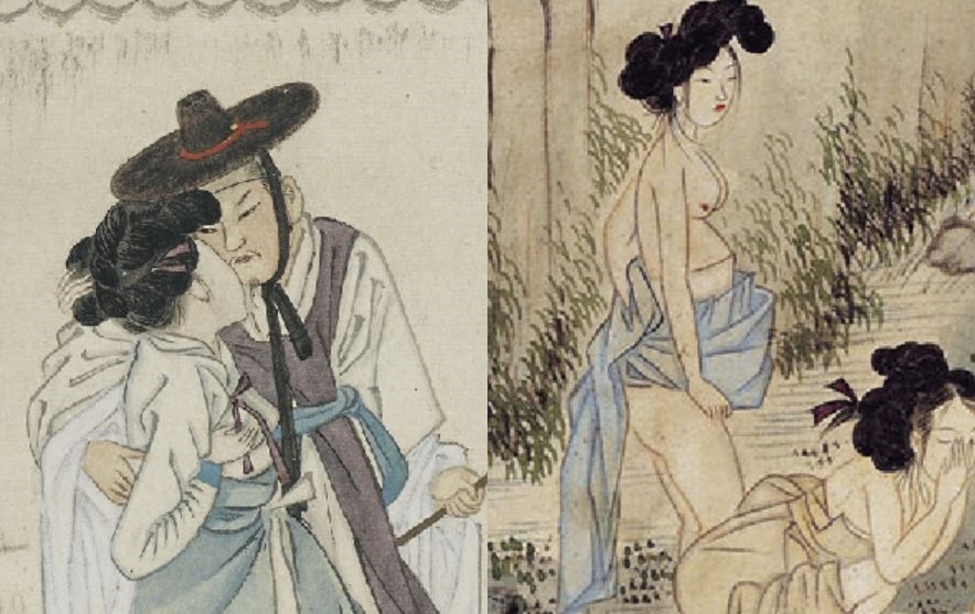 먼저 ‘단오풍정(端午風情)’을 볼까요. 단옷날 기녀들이 속살을 드러난채 목욕하고 그네 타는 모습을 포착한 그림인데요. 한 여인은 주요부분만 치마로 살짝 가리고 젖가슴과 볼록 나온 배, 엉덩이와 장딴지의 맨살을 드러낸채 서있습니다. 그래서 이 그림을 두고 ‘조선 최초의 누드화’라 하는 분들도 있어요.