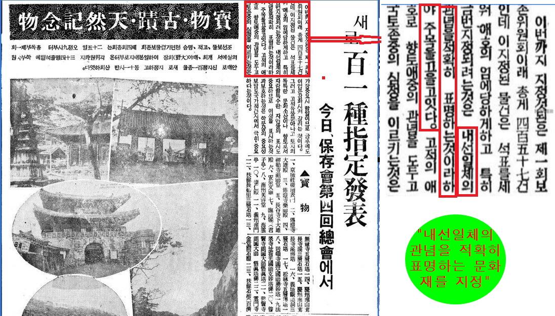 마지막 궁금증이 있죠. 일제는 왜 조선의 문화재에 단 한 점의 ‘국보’도 없이 보물과 고적. 천연기념물만 지정했을까요. 뭐 안봐도 비디오죠. 일제가 줄기차게 주장한게 ‘일본과 조선이 한몸’이라는 ‘내선일체’잖습니까. 조선은 일본의 식민지이며, 따라서 일본의 국보가 식민지 조선의 국보라는 거죠.