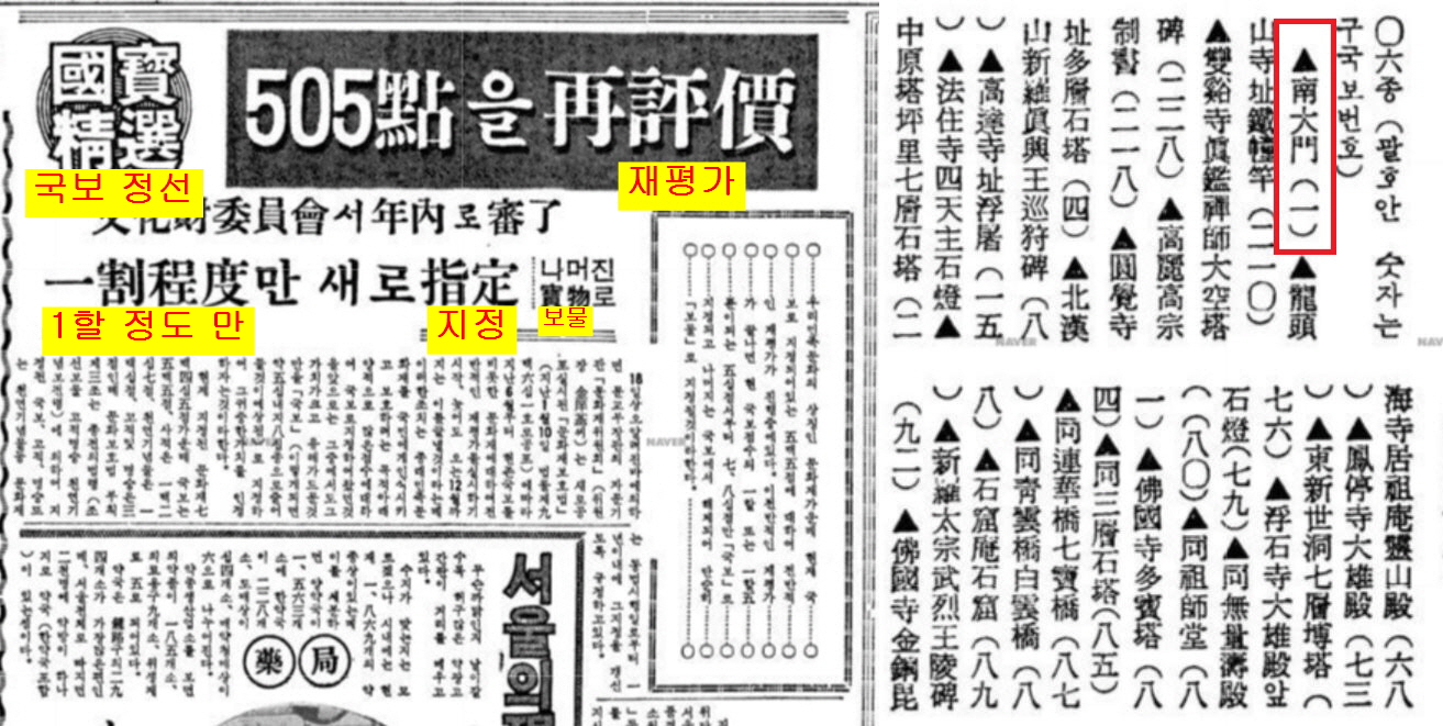문제는 이렇게 일제가 지정한 문화재가 해방 후에도 아무런 비판없이 답습됐다는 겁니다. 1962년 문화재보호법을 제정하면서 지정문화재를 국보와 보물로 나누어 지정한 거죠. 이때 보물 1·2호였던 남대문과 동대문은 국보 1호와 보물 1호가, 고적 1호였던 포석정은 사적 1호가 된겁니다.