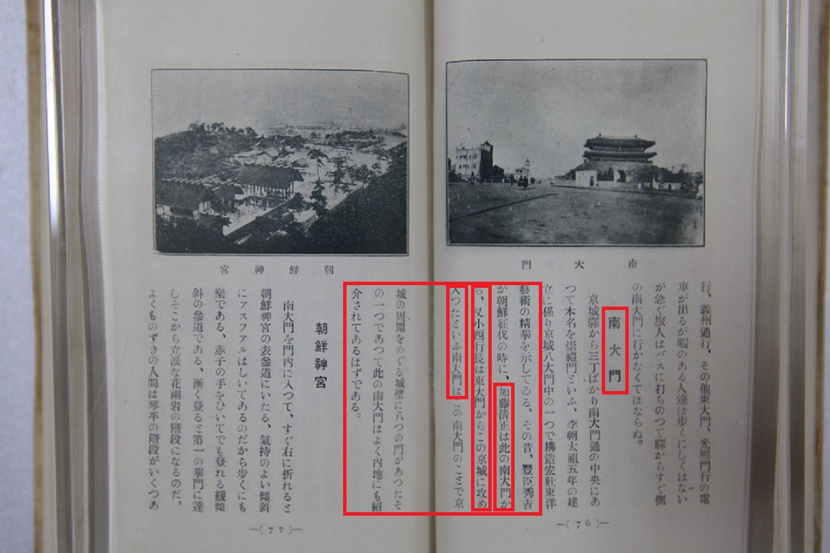 실제로 1927년 간행된 조선여행안내서(<趣味の朝鮮の旅>)’를 보면 “가토 기요마사가 남대문에서, 고니시 유키나가가 동대문에서 경성으로 쳐들어갔다고 한다”고 소개합니다.