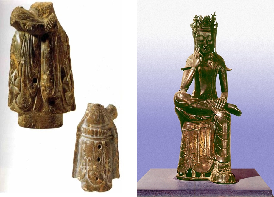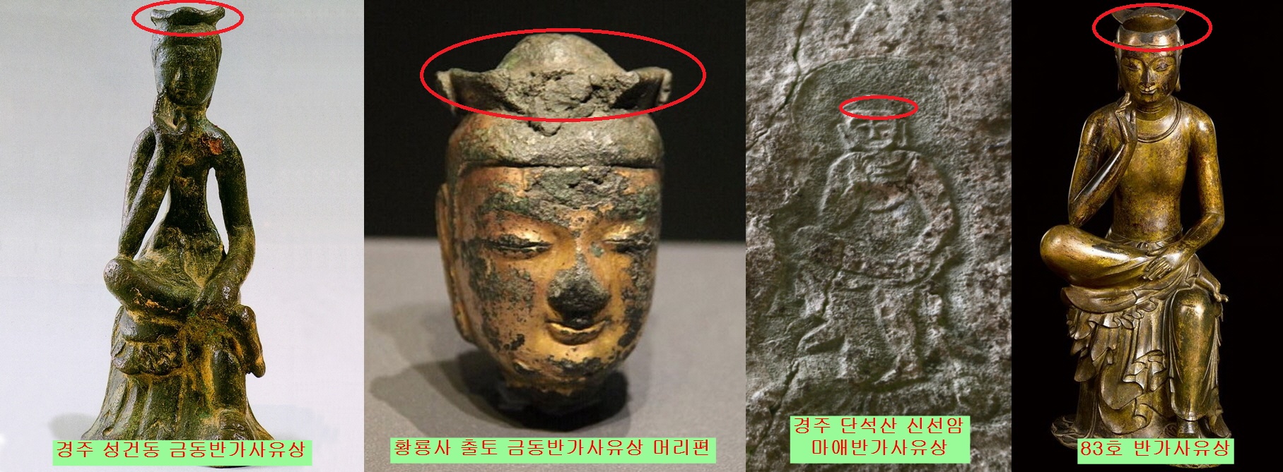 그러나 장식은 없지만 강렬한 인상을 주는 세 개의 반원을 이어붙인 양식은 신라지역에서 주로 보인답니다. 경주 단석산 신선암 마애반가사유상, 황룡사 출토 금동반가사유상 머리편, 경주 성건동 출토 금동반가사유상 등이 대표적인데요. 또 83호와 비교 대상인 조각상은 경북 봉화 북지리 출토 석조반가사유상(보물)과, 앞서 인용한 고류지 목조반가사유상(일본 조각부문 국보 1호)이 있어요.