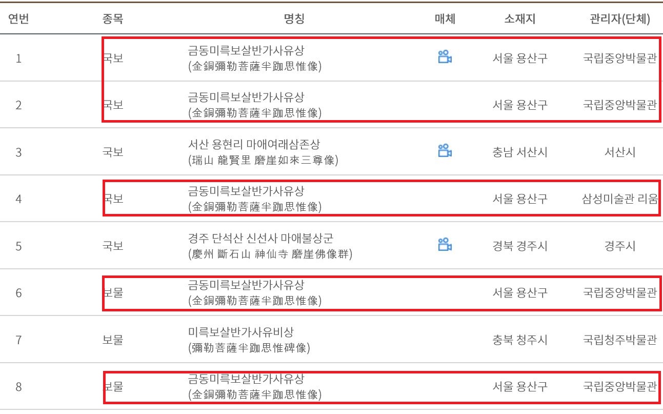 78·83호 반가사유상이 대표적인 케이스네요. 제가 문화재청 문화재검색 사이트에서 ‘금동미륵반가사유상’을 써 넣었더니 똑같은 이름으로 국보 3건, 보물 2건이 검색되더군요. 국보 중 두 건은 78·83호였구요.