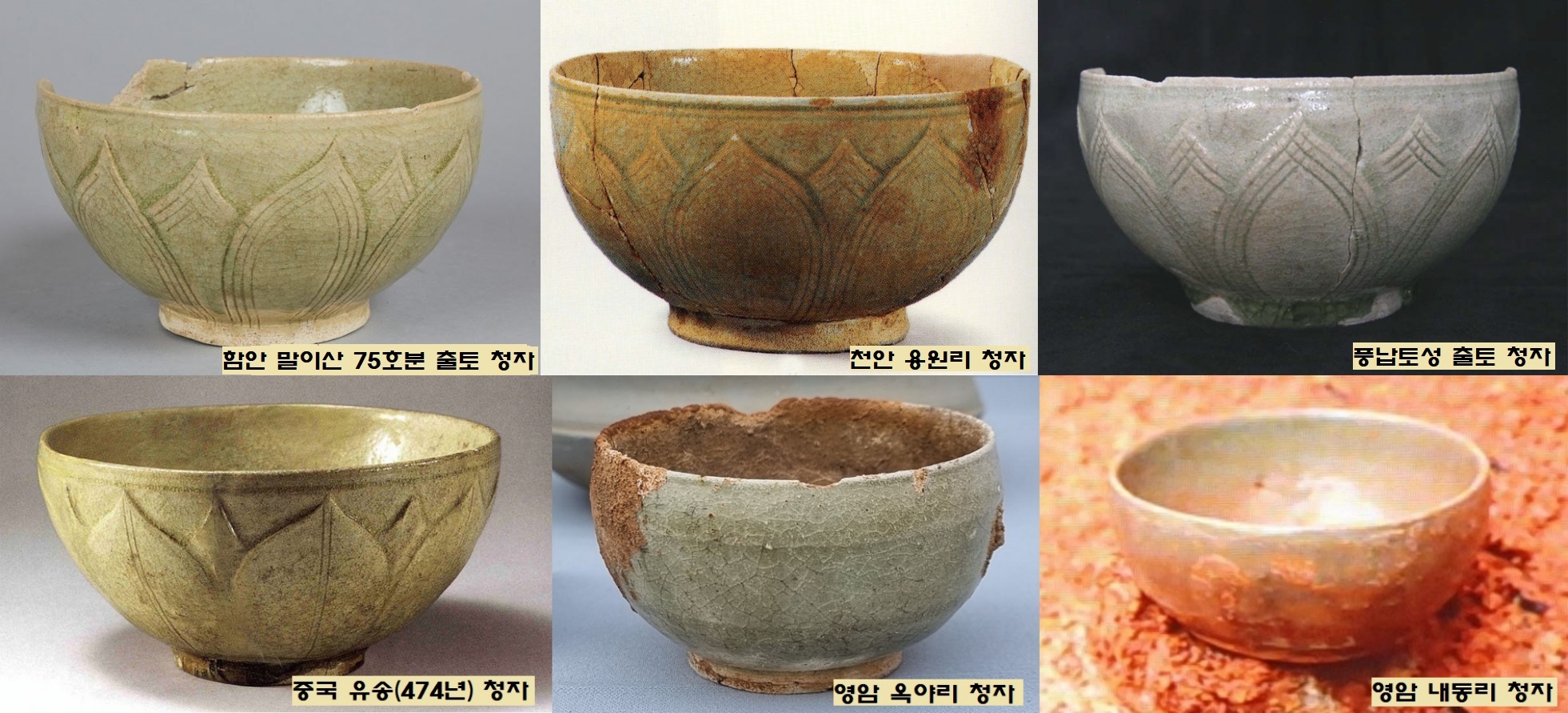 한성백제의 왕성인 풍납토성(미래마을)에서 출토된 대옹(큰 항아리) 속에서 확인된 중국제 청자그릇과도 흡사하다. 4개(+중국제)의 청자 사진을 비교해보면 약간 초를 쳐서 ‘쌍둥이’ 같다고 해도 과언은 아니다. 전라도에서도 비슷한 청자가 출토된 적이 있다는 연구자들의 증언(?)이 줄을 이었다. 새삼 5세기대 청자를 매개로 한 동북아시아의 활발한 네트워크를 상상해보았다.