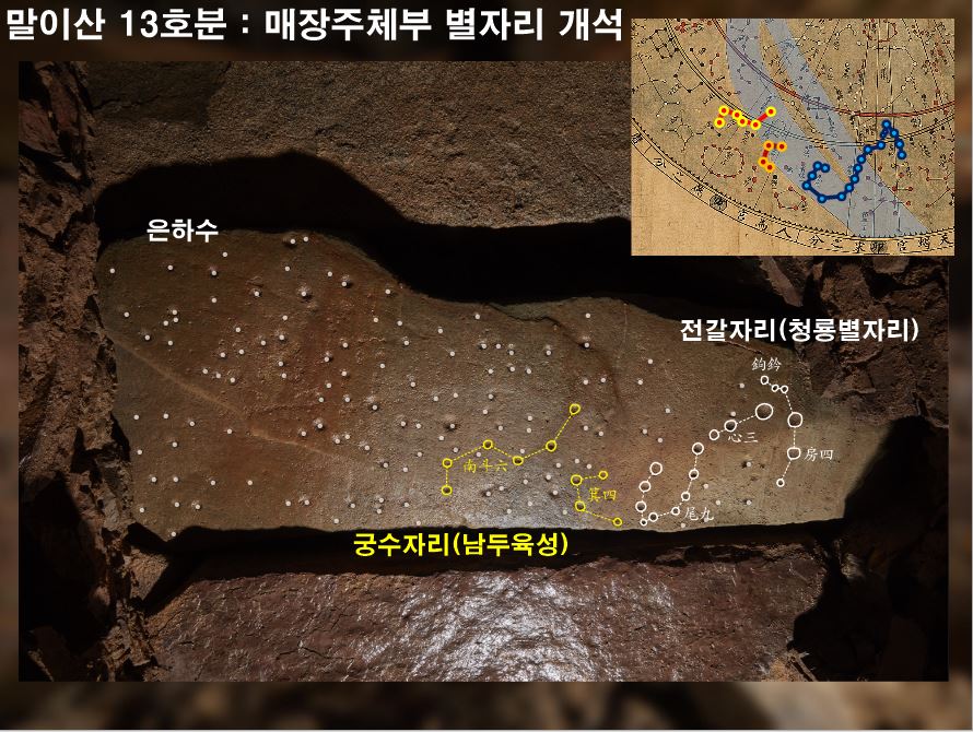 아라가야인들은 생명이 만발하는 봄철 남쪽 하늘에 나타나는 별자리를 그린 것이라 해석할 수 있겠다. 무덤 안에 별자리를 새겨넣은 것은 고구려의 전통이기도 하다. 고구려 무덤 중 22기에서 북두칠성과 남두칠성을 새겨넣었다.