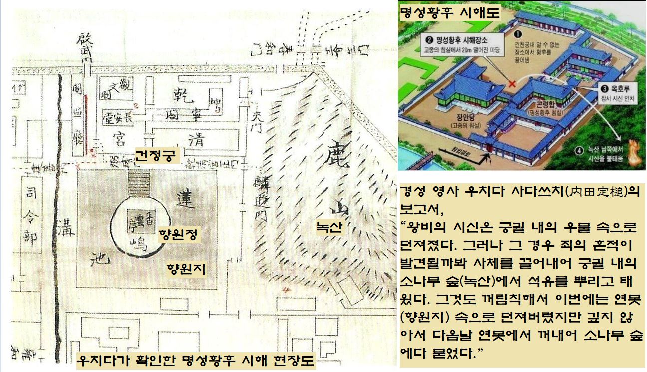 “사건 관계자에게 들은 바로는 왕비의 시신은 궁궐 내의 우물 속으로 던져졌다. 그러나 그렇게 되면 곧바로 죄의 흔적이 발견될까봐 사체를 끌어내어 궁궐 내의 소나무 숲에서 석유를 뿌리고 태웠다. 그것도 꺼림칙해서 이번에는 연못(향원지) 속으로 던져버렸지만 깊지 않아서 다음날 다시 꺼내어 소나무 숲에다 묻었다.”