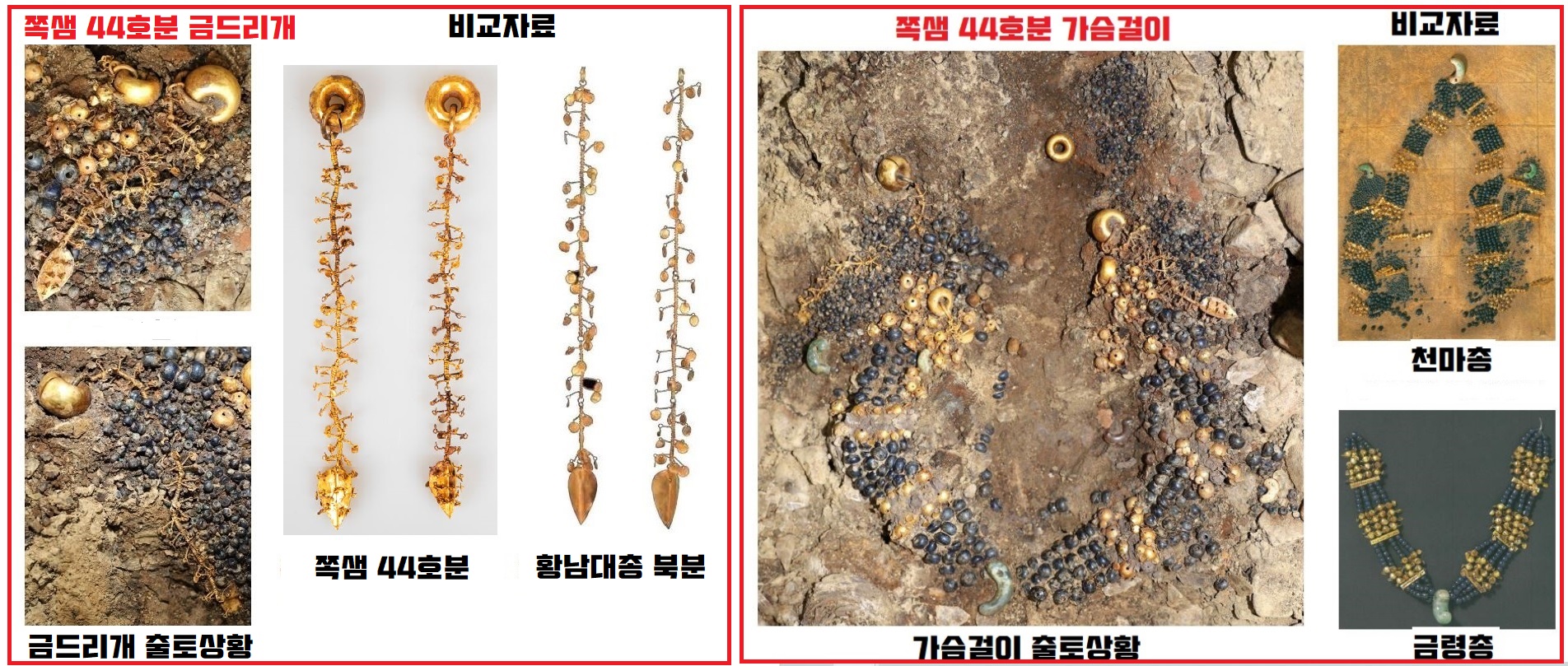 무엇보다 이 쪽샘 44호분에서 쏟아져 나온 유물의 특징은 ‘아담 사이즈’라는 데 있는데요. 노출된 44호분 금동관의 추정 높이(약 18㎝)는 황남대총 북분(높이 27.3㎝)과 금관총(27.5㎝) 및 금령총(27㎝) 등에 비해 상당히 작은 편이거든요. 관테와 세움장식 역시 상대적으로 작구요. 출토된 허리띠의 좌우 폭(34㎝) 역시도 작은 편에 속합니다.