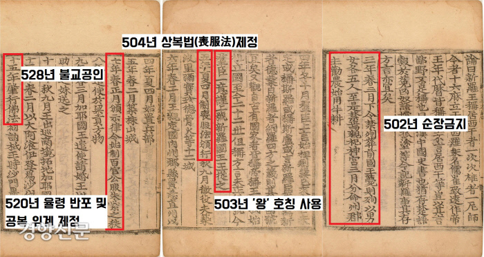 6세기 개막과 함께 왕위의 오른 지증왕(재위 500~514)이 순장을 금하고(502) 왕의 호칭을 사용하며(503) 상복법을 제정하는 등(504) 상장례를 개편하죠. 지증왕의 뒤를 이은 법흥왕(514~540)이 율령을 반포(520)하고 불교를 공인(528)하죠.