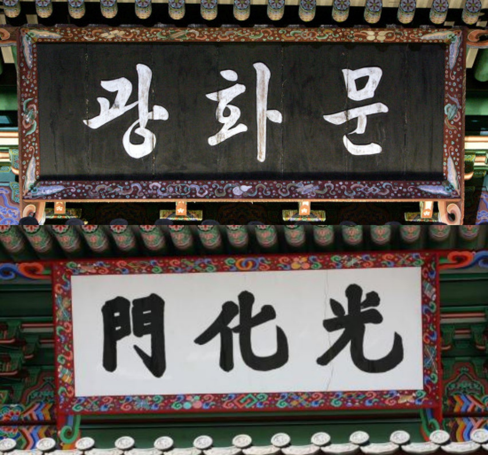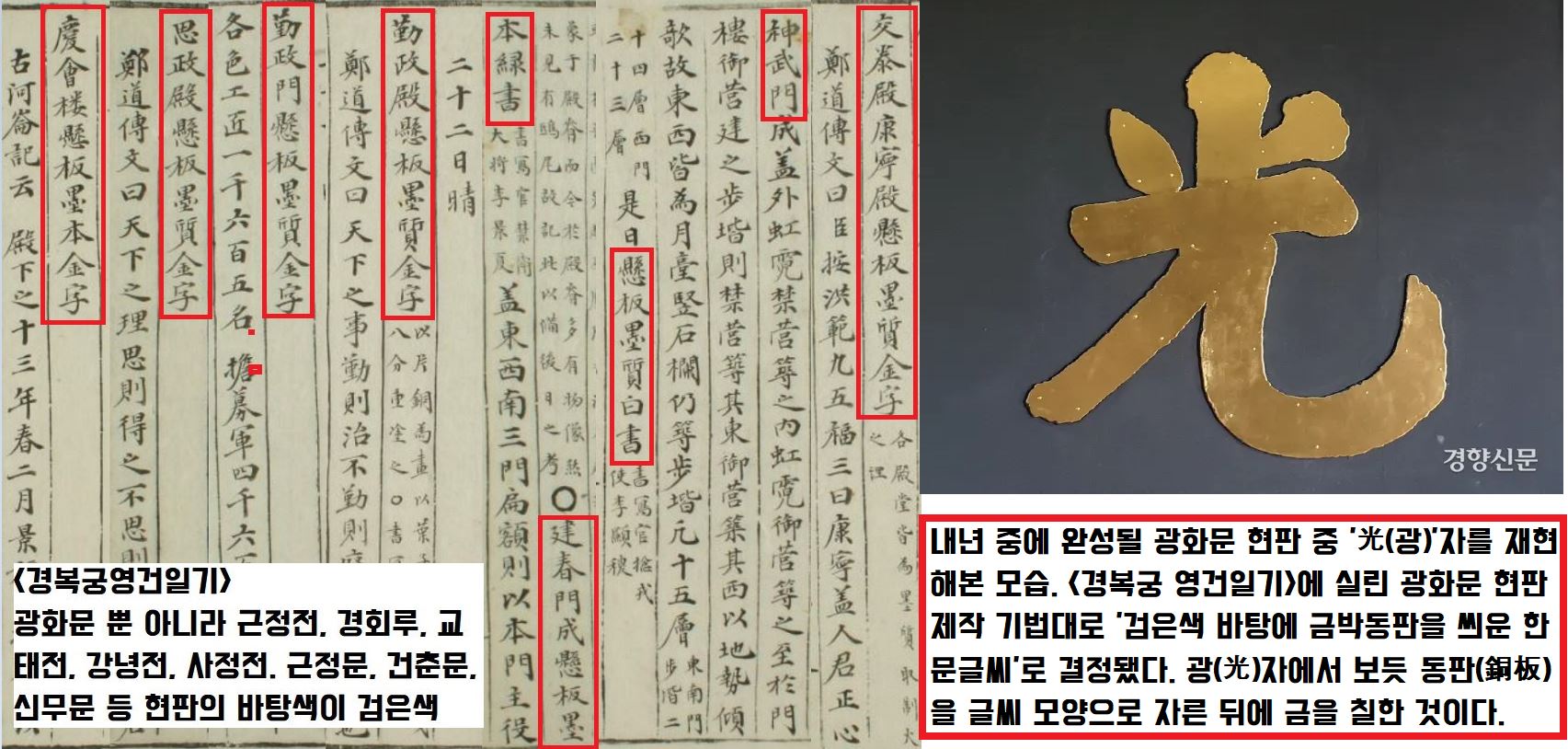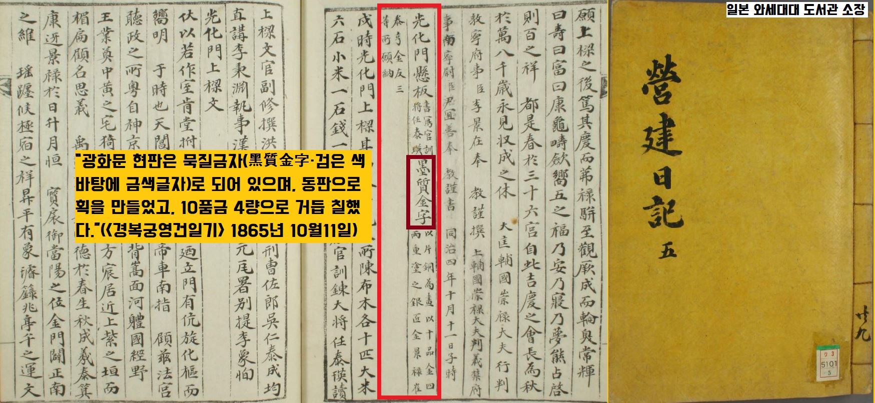 즉 <경복궁 영건일기> 1865년 10월11일자는 “광화문 현판은 묵질금자(黑質金字·검은 색 바탕에 금색글자)로 되어 있으며, 동판으로 획을 만들었고, 10품금 4량으로 거듭 칠했다”고 했습니다.