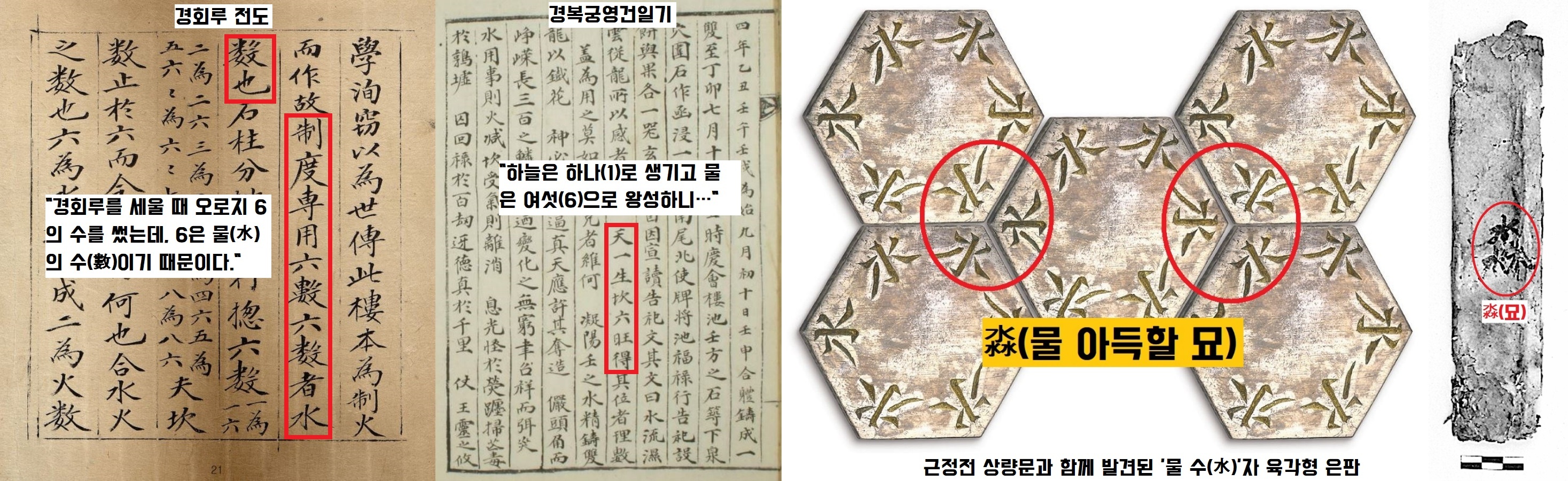 앞서 인용한 <경회루전도>와 <경복궁영건일기> 등에 숫자 ‘6’이 유독 강조되었잖아요. <주역>에서 6은 물의 숫자였다는 거죠. 그런데 재미있는 것이 더 있습니다. 발굴단에서 육각형 은판 5점을 붙여보았는데요.