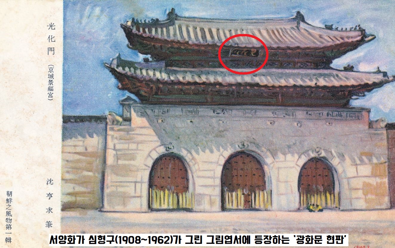 1940년 서양화가 심형구(1908~1962)가 그린 그림엽서에 등장하는 ‘광화문 현판’에도 어두운 바탕에 밝은 색의 글씨가 보입니다.