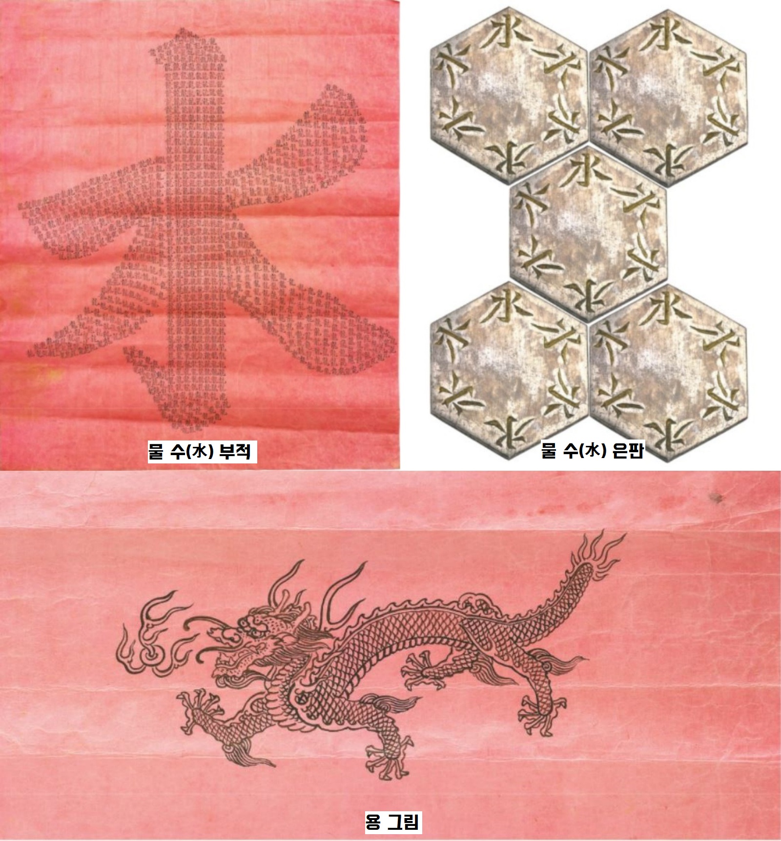 ‘물(水)’과 ‘용(龍)’으로 도배한 부적 3점과 육각형판 5점이 보인 겁니다. ‘용’ 부적의 목적은 분명했죠. 임금을 상징하는 상상의 동물이기도 하지만, 앞에서 살펴봤듯이 ‘물의 신’으로 알려져 있으니까요.