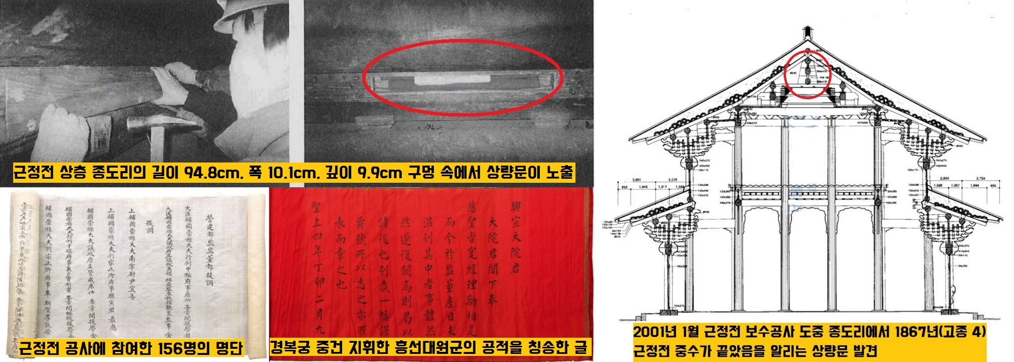 그뿐이 아닙니다. 그런데 4년 뒤인 2001년 1월, 근정전 중수공사를 위해 종도리를 살피던 조사단의 눈이 무언가가 걸렸습니다. 1867년(고종 4) 근정전의 중수가 끝났음을 알리는 상량문(上梁文)이 발견된 겁니다. 상량문에는 공사 담당자 156명의 명단과 흥선대원군의 업적 등이 담겨 있었는데요. 그러나 정작 조사단의 눈을 잡아끈 대목은 따로 있었습니다.
