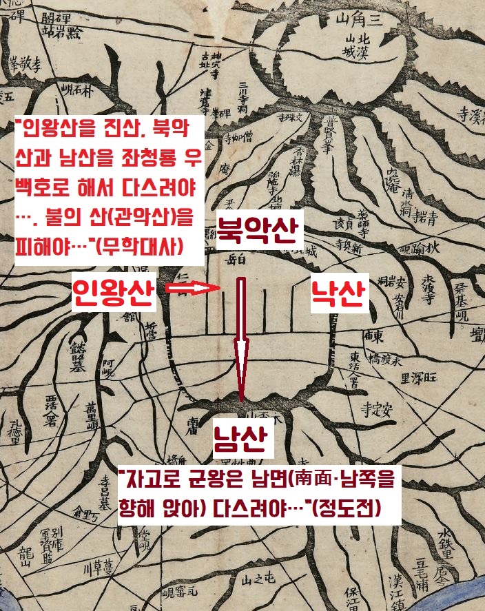 “한양의 진산을 인왕산으로 잡고 북악과 남산을 좌우의 청룡백호로 삼아야 한다”는 무학대사(1327~1405)와 “제왕은 남면(南面·남쪽을 향해 앉아 다스려야 한다는 뜻)해야 한다”는 정도전(1342~1398)의 논쟁이 벌어졌다는 겁니다.