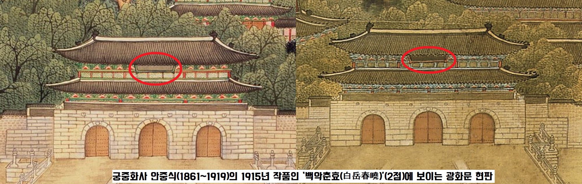 2015년 궁중화사 출신의 안중식(1861~1919)의 1915년 작품인 ‘백악춘효(白岳春曉)’(2점)에서 검은색 바탕의 광화문 현판이 보인다는 등의 자료를 공개한 논문(강임산의 ‘1968년 광화문 복원의 성격’, 명지대 석사논문, 2015)이 나왔습니다.