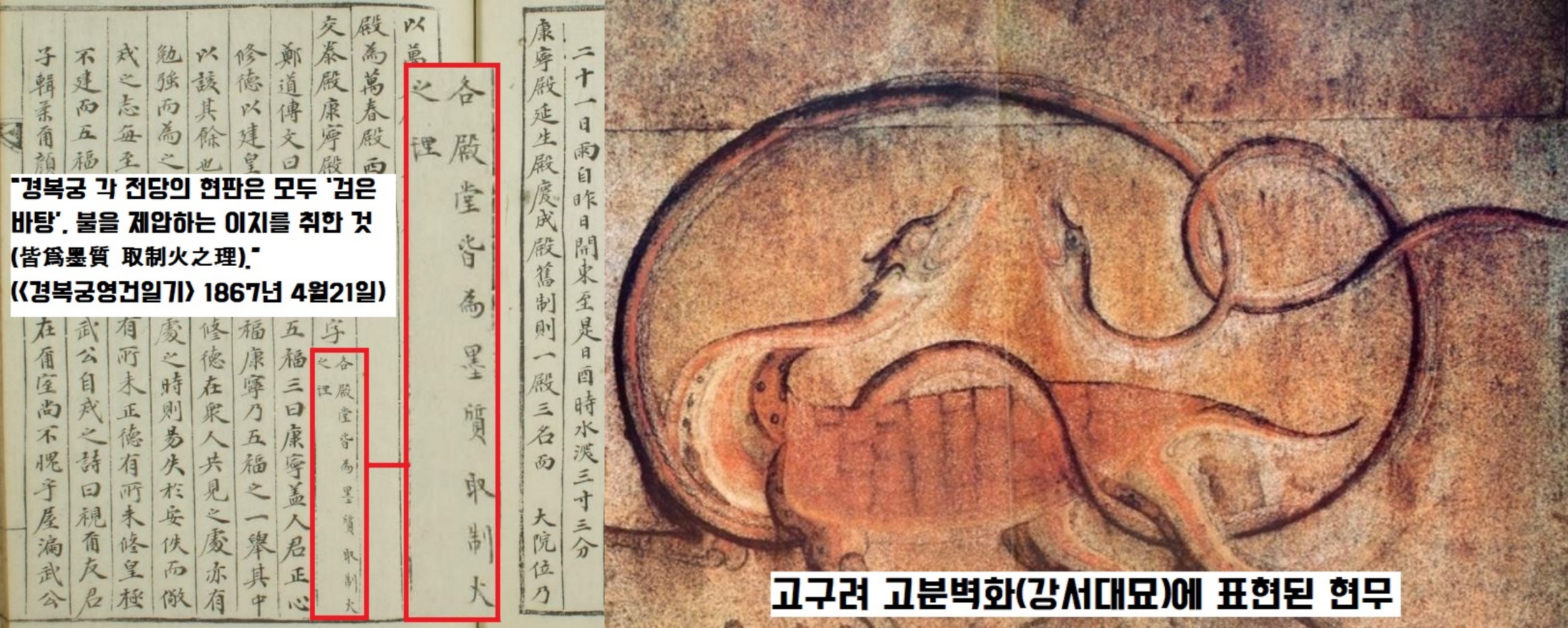 검은 색이 불을 제압한다구요. ‘검은 색’은 사신도의 ‘북 현무(北 玄武)’에서 보듯 음양오행 가운데 ‘북쪽과 물(水)’을 상징합니다. 그렇습니다. 경복궁 중건 때 각 전각의 현판을 검은색 바탕으로 한 이유는 바로 ‘화재방지용’이었던 겁니다.