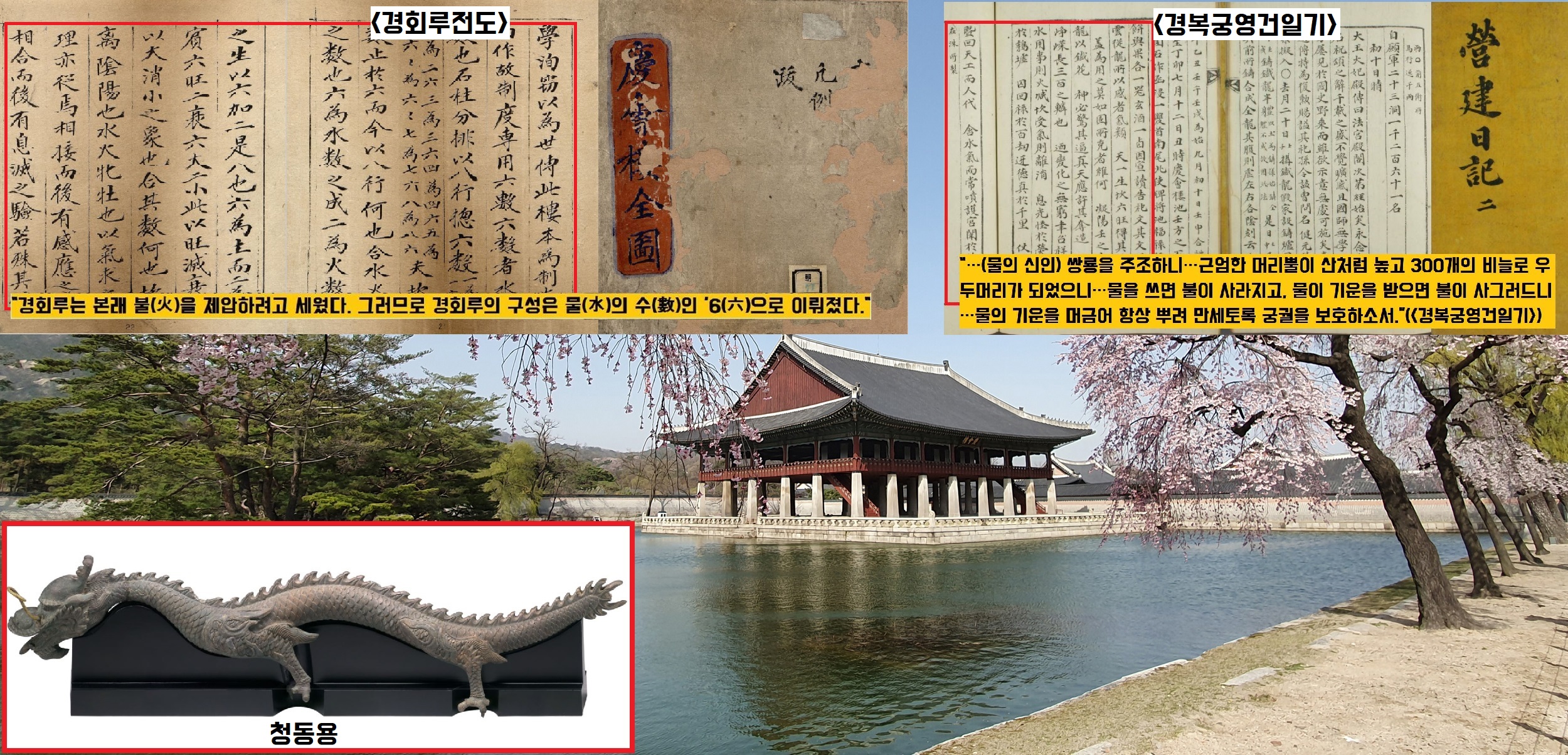 즉 <경회루 전도>는 “경회루 연못의 북쪽(감방·坎方·물의 방향)에 (불을 진압한다는 의미에서) 물의 신인 청동용(銅龍) 두마리를 잠겨넣었다”고 썼거든요. “불을 제압하려고 세운 경회루의 모든 구성은 ‘물의 숫자’인 ‘6’으로 이뤄졌다. 청동용 2마리를 연못에 넣음으로써 불 기운이 있는 ‘동(銅)’과 불의 수인 ‘2’를 물을 상징하는 ‘감육(坎六) 방향’(북쪽)에 넣어 높은 수인 6이 낮은 수인 2를 누르고자 한 것이다.”(<경회루전도>)