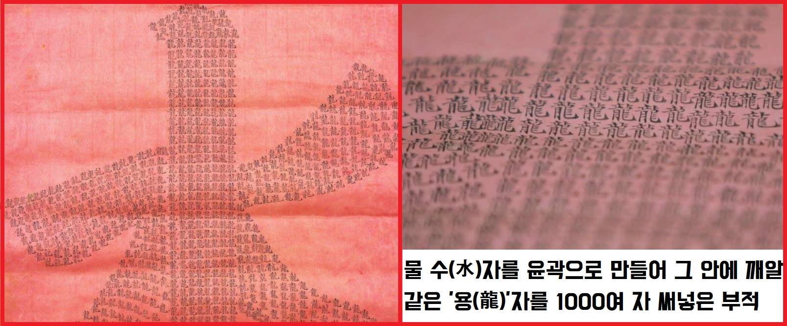 그런데 한 장도 아닌 두 장에 ‘용(龍)’자를 깨알같이 1000여 자씩 메워 썼는데, 완성된 글자가 다름아닌 물 ‘수(水)’자 였습니다. 다른 부적 1점은 역시 용을 그린 묵룡화였습니다