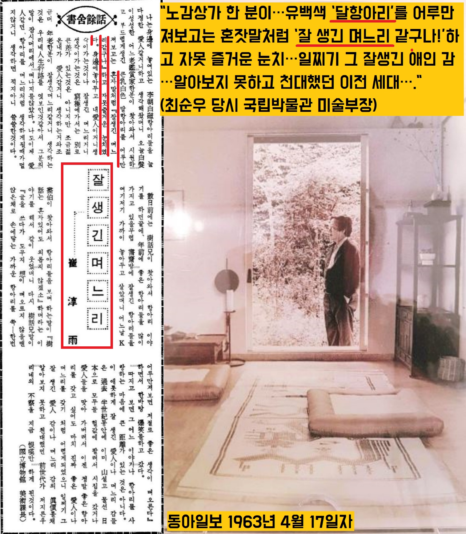 김 화백과 평생 교유했던 미술사학자 최순우도 1963년 4월 17일 동아일보에 기고한 글에서 ‘달항아리 예찬론’을 펼칩니다.