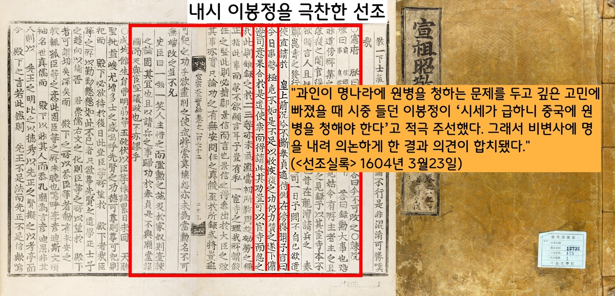 “과인이 명나라에 원병을 청하는 문제를 두고 깊은 고민에 빠졌을 때 시중 들던 이봉정이 ‘시세가 급하니 중국에 원병을 청해야 한다’고 적극 주선했다. 그래서 비변사에 명을 내려 의논하게 한 결과 의견이 합치됐다.”(1604년 3월23일)
