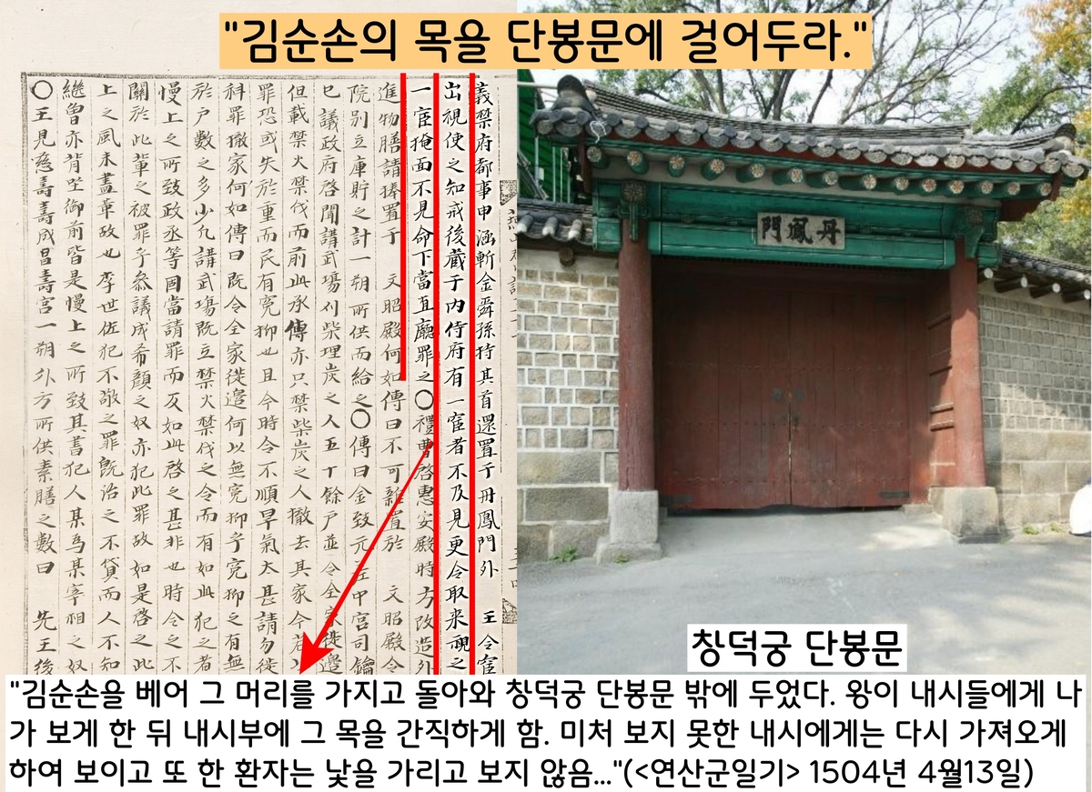 연산군이 김순손을 서울로 압송하지 않고 ‘제주도 현지 처형’을 주장한 이유가 있다. 김순손이 ‘연산군의 난행’을 적나라하게 진술할 것이 두려웠기 때문이었다. 연산군은 결국 제주에서 김순손을 참형에 처했다. 김순손의 머리를 창덕궁 단봉문에 걸어 두고 내시들에게 보인 뒤 내시부에 간직하게 했다.