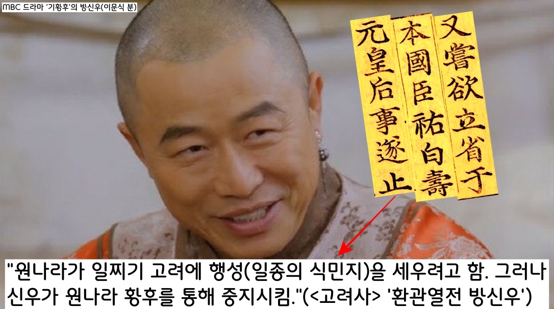 일찍이 원나라가 고려에 행성(일종의 식민지)을 세우려 했다. 그러자 방신우가 황태후를 설득하여 그 계획을 취소시켰다.