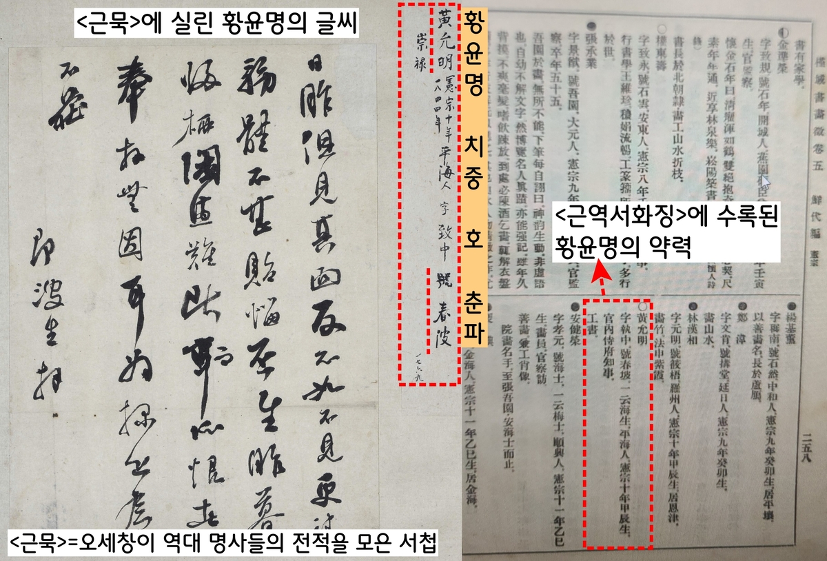 그 뿐이 아니었다. 황윤명은 ‘시서화삼절(詩書畵三絶)’로 칭송받은 ‘문인 내시’였다. ‘육교시사’(1870년대 후반 위항 문인의 모임)의 일원으로 활동했다. 황윤명의 글씨는 위창 오세창(1864~1953)의 <근묵>에 실려있고, 역대서화가의 평전인 <근역사화징>에도 이름이 올라있다.