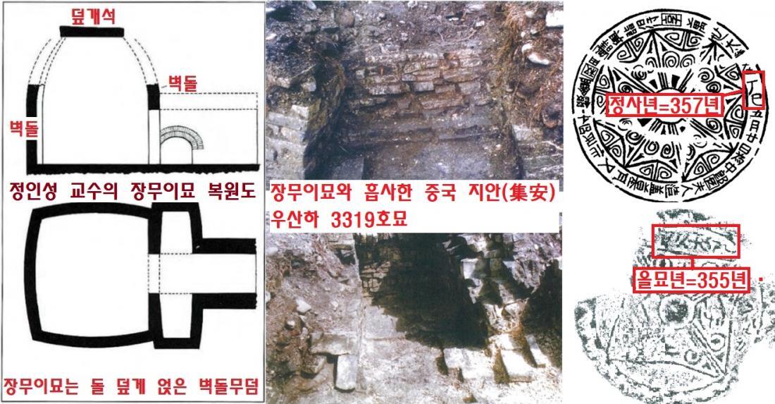 ‘장무이묘’와 가장 유사한 고분의 형태는 지안(集安)의 우산 3319호이다. 매장주체부를 벽돌로 쌓았고, 석회로 싸발랐다. 무덤방에서 확인된 명문 기와 중에 ‘355년’과 ‘357년’으로 읽힐 수 있는 간지가 보였다. 비슷한 연대에 제작된 중국제 도자기도 있었다. 그렇다면 어떨까. ‘장무이묘’ 역시 대방군이 소멸된 313년 후에 조성됐다는 이야기가 아닐까. ‘무신년’ 간지가 맞다면 ‘288년’이 아니라 ‘348년’일 가능성이 짙다.