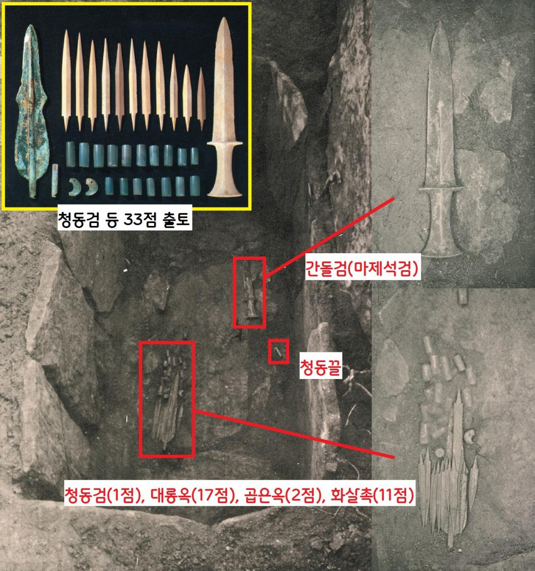 바닥면에 요령식 청동검과 함께 청동끌, 대롱옥, 곱은옥, 화살촉, 간돌검(마제석검) 등 33점의 유물이 고이 놓여져 있는 것이 아닌가. 이중 요령식 동검은 1950년 무렵부터 중국 요령성(遼寧省·라오닝성)에서 집중 출토되던 청동검이다. 중국식 악기인 비파를 닮았다고 해서 비파형 동검이나, 혹은 발해연안에서 집중 출토된다해서 발해연안식 동검 등 다양한 명칭으로 일컬어진다. 기원전 9~8세기 유물로 편년된다.
