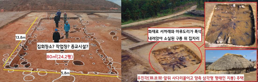 구릉 상부에서 확인된 약 25평짜리 건물은 공공 집회장이나 작업장, 혹은 종교시설 등으로 보인다. 화재로 서까래와 마루도리까지 폭삭 주저앉아 소실된 건물도 있다. 그 집자리는 우진각(隅進閣·앞뒤 사다리꼴이고 양측 삼각형인 지붕) 주택으로 복원된다.|국립부여박물관 제공