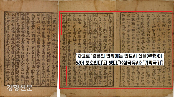 얼마 후 도적 떼 몇 몇이 다시 사당에 침입했는데요. 이번에는 길이가 30여척(약 9m)나 되는 큰 구렁이가 나타나 도적들을 물어죽였다고 하죠. <삼국유사>는 가락국 사당에서 일어난 갖가지 기현상을 소개하면서 “왕과 왕족의 무덤 안팎에는 반드시 신물(神物)이 있어 보호한다는 것을 알게 되었다”고 전했습니다.