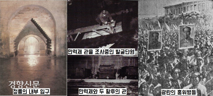 만력제의 시신은 지주계급의 총대표이자 반동분자의 상징으로 치부되었습니다. 15~16세에 불과한 어린 홍위병들은 만력제와 두 황후의 시신을 정릉 박물관 앞에 늘어놓고 구호를 외치기 시작했습니다.