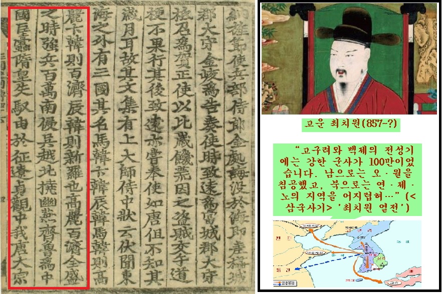 “고구려와 백제의 전성기에는 강한 군사가 100만이었습니다. 남으로는 오·월을 침공했고, 북으로는 연·제·노의 지역을 어지럽혀…”(<삼국사기> ‘최치원 열전’)