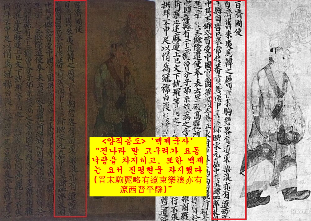 <송서> 뿐이 아니다. 523~536년 사이 중국 남조 양나라(502~557)에 파견된 각국 사절을 그림으로 그려 해설한 <양직공도>에도 나온다. 즉 “진나라 말 고구려가 요동 낙랑을 차지하고, 또한 백제는 요서 진평현을 차지했다(晋末駒麗略有遼東樂浪亦有遼西晋平縣)”는 것이다.
