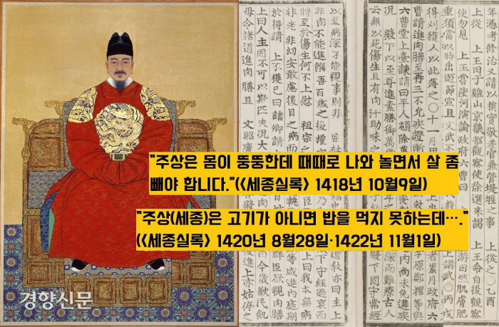 상왕으로 물러난 태종이 막 즉위한 세종에게 “주상은 몸이 뚱뚱한데 때때로 나와 놀면서 살 좀 빼야 한다”(<세종실록> 1418년 10월9일)고 권했거든요. 그뿐 아니라 태종은 “주상(세종)이 고기가 아니면 밥을 먹지 못하는데…”라고 걱정하는 유언까지 남겼답니다.(<세종실록> 1420년 8월28일·1422년 11월1일)