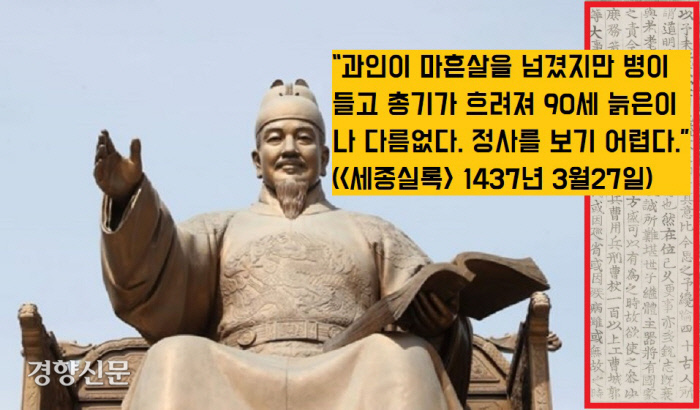 세종은 “나이 40을 넘겼지만 이제 ‘예지(銳志)’가 흐려져 90세 늙은이나 다름없다”면서 “게다가 병까지 생겨서 이른 아침부터 밤늦게까지 정사를 보기가 견디기 어렵다”고 호소했습니다.