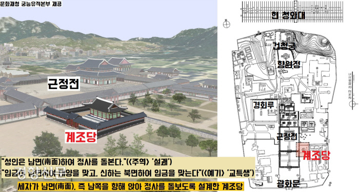 기어코 대리청정을 성공시킨 세종은 1443년 4월17일 세자가 신료들의 조회를 받으며 정사를 펼칠 정당(집무실)을 세웠습니다. 그것이 계조당입니다. 세종은 원래 계조당을 남쪽을 향해 지었습니다.