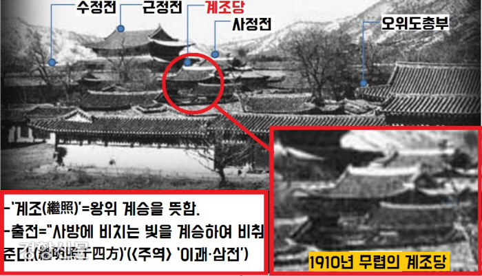 ‘계조(繼照)’ 명칭은 ‘사방에 비치는 광명을 계승하여 비춰준다(以繼明照于四方)’는 <주역> ‘이괘·삼전’의 구절에서 따왔습니다. 따라서 ‘계조’은 왕위계승을 뜻합니다. ‘계조당’의 복원은 고종 연간에 재건하고(1866), 25년 뒤 보수된(1891) 전각을 모델로 삼고 있습니다.