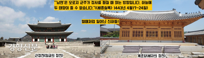 “세자가 남면(南面·남쪽을 향함)해서 정사를 펼칠 수 있도록 해야 한다”는 뜻이었습니다. 그러나 대소신료들이 벌떼처럼 일어났습니다. ‘남면’은 오로지 군주가 정사를 펼칠 때 앉는 방향이기 때문입니다. 신료들은 “하늘에 두 태양이 뜰 수 없다”며 일제히 반대했습니다. 그러자 세종은 이 대목에서는 ‘그까짓것’하며 양보했습니다. ‘대리청정’을 받아냈으니 ‘남면’ 카드는 슬쩍 버린 겁니다. 결국 세자는 계조당 안에서 서쪽을 향하는 ‘서면’으로 대신들을 맞는 것으로 결정됐습니다.