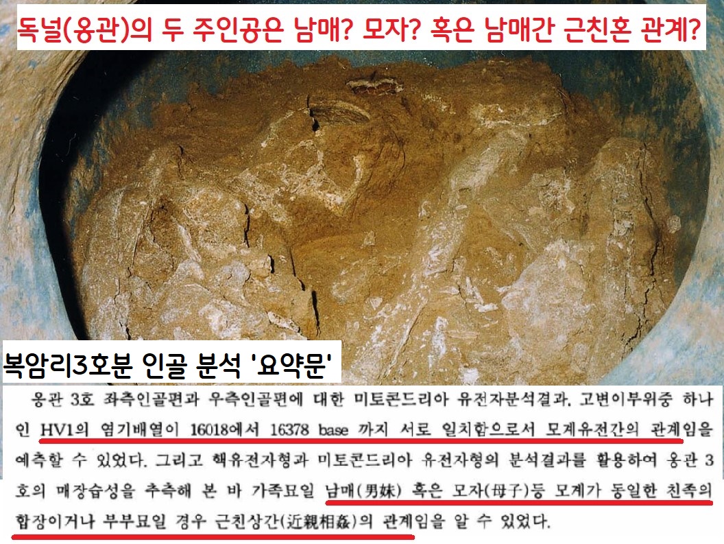 그런데 그 뒤에 붙인 ‘보고서 요약문’이 흥미롭다. “이 합장묘(96석실)의 주인공은 남매, 혹은 모자 등 모계가 동일한 친족이거나, 부부묘일 경우 근친상간(近親相姦) 임을 알 수 있다”는 것이다.