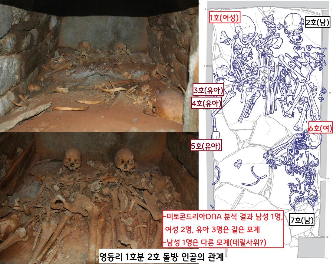 영동리 1호분 2호 돌방에 안장된 7명 중 6명은 같은 모계 출신일 가능성이 짙다. 그러나 다른 모계로 판단되는 남성 한 명은 다른 곳에서 장가온 데릴 사위일 가능성이 짙다.|동신대영산강문화연구센터 제공