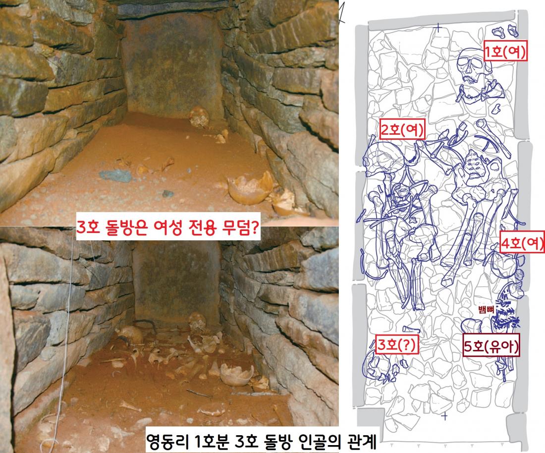 또 5기의 주검이 확인된 3호 돌방의 경우 1호 여성(60대)→2호 여성(20대)→4호 여성(10대 후반)→5호 유아(5세 이하)→3호 인골(미상)의 순으로 묻혔다. 그런데 5세 이하 유아이거나 성별 미상의 인골을 빼면 모두 여성이라는 공통점이 있다.(김재현 동아대 교수) 그렇다면 이 3호 돌방은 ‘여성 전용 고분’일 가능성도 있다. 또하나 착안점은 2호와 3호 돌방무덤에는 오로지 주검(시신)만 매장했다. 죽은 순서대로 인골만 추려 안장했다.