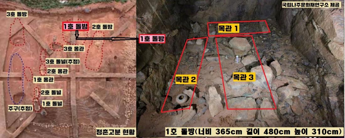 한 가운데 두꺼운 판석을 세워 두 개의 방으로 나눴다. 훼손이 심했던 한쪽 방의 유물 분석은 쉽지 않았다.