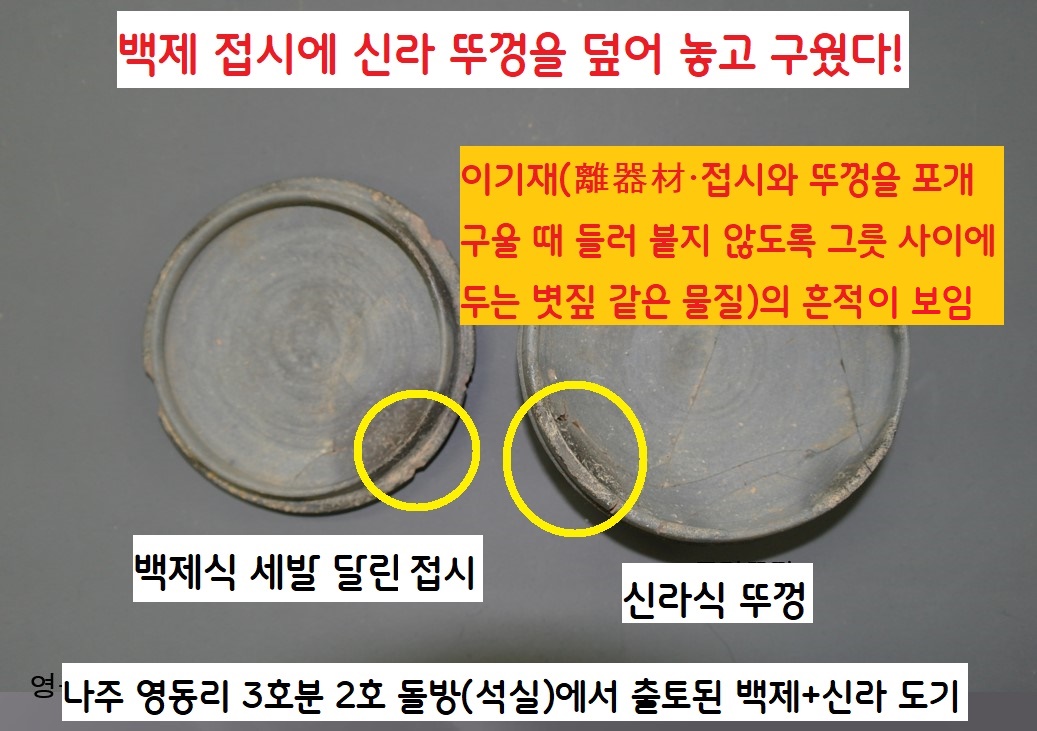 나주 영동리 3호분 2호 돌방에서 출토된 도기. 뚜껑은 전형적인 신라식이고, 세발 달린 그릇은 영락없는 백제식이다. 백제+신라 도기는 백제접시에 신라 뚜껑을 덮어두고 구운 흔적이 역력하다. 구울 때 들러 붙지 않게 깔아둔 이기재의 흔적이 보인다. |동신대 영산강문화연구센터 제공