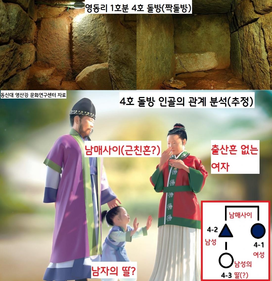 영동리 1호분 2호 돌방에 안장된 7명 중 6명은 같은 모계 출신일 가능성이 짙다. 그러나 다른 모계로 판단되는 남성 한 명은 다른 곳에서 장가온 데릴 사위일 가능성이 짙다.|동신대영산강문화연구센터 제공