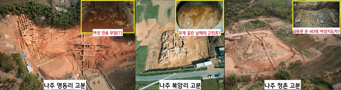 영산강 유역인 나주 복암리와 영동리, 정촌 고분 등에서 ‘여성파워’, 즉 모계사회의 흔적을 잇달아 나타나고 있다. 40대 여성 지도자와 모계가 같은 남매끼리의 근친혼을 짐작할 수 있는 무덤과, 여성들만 보이는 여성전용 무덤의 흔적이 잇달아 나타나고 있다.|국립나주문화재 연구소·동신대영산강문화연구센터 제공